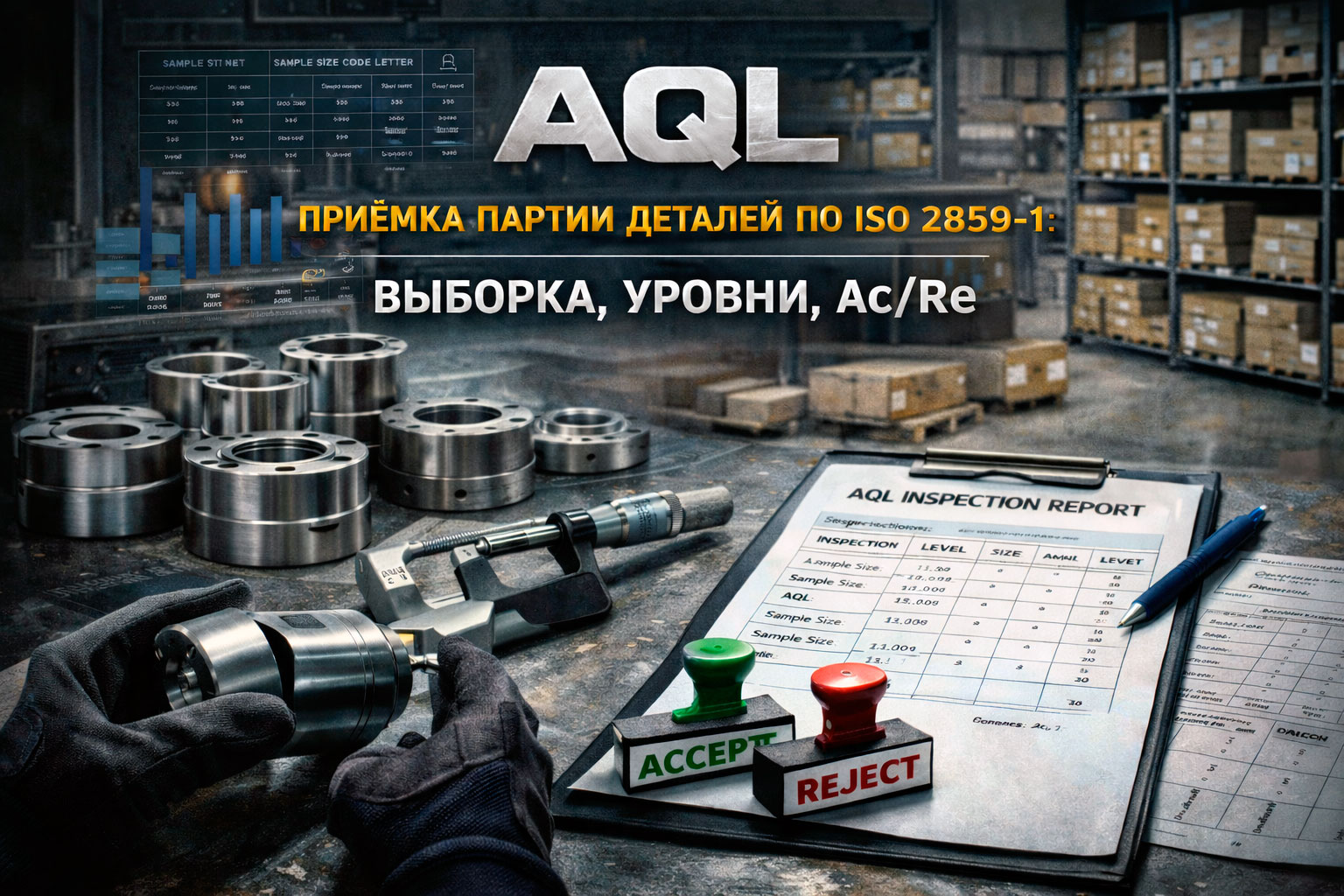 Простая логика: вы задаёте условия (тип дефектов и уровни AQL, уровень инспекции, размер партии), затем по таблицам стандарта определяете размер выборки и пороги Ac/Re.